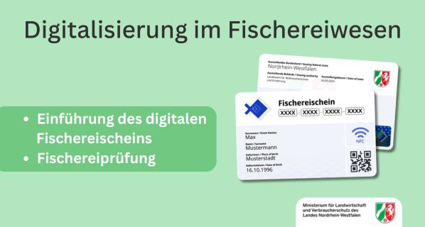 Aktuell wird die Fischereischeinverwaltung in Nordrhein-Westfalen auf moderne und digitale Verfahren umgestellt. Nach Verabschiedung des Landesfischereigesetzes durch den Landtag Nordrhein-Westfalen können Bürgerinnen und Bürger voraussichtlich ab dem 1. Juli 2026 zwischen einer Antragstellung vor Ort in der örtlich zuständigen Behörde (Gemeinde oder Stadt) oder via Onlinedienst rund um die Uhr von Zuhause aus wählen. Mit der geplanten Änderung des Landesfischereigesetzes werden Fischereischeine im neuen Format als fälschungssichere Scheckkarten mit NFC-Chip und als elektronische Zertifikate auf dem Smartphone eingeführt.